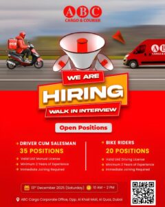 13/12/2025 Interview Time : 10:00 am to 1:00 pm Interview Location : ABC Cargo & Courier, Opposite Al Khail Mall, Al Quoz, Dubai-Uae |