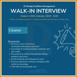 October 4, 2025 Interview Time : 09:00 – 15:00 Interview Location : Al Mirqab Compound-2, Clubhouse Building 38, Sidr Street, Al Waab, Doha |