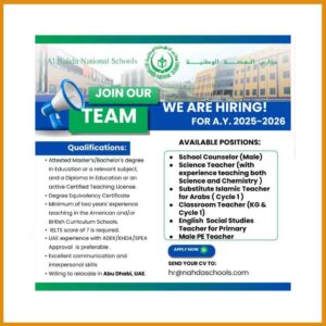 A: No, this is a direct job vacancy from Al Nahda National school and there are no intermediaries involved. If you are selected, you will be hired by Al Nahda National school Abu Dhabi and there will be no cost to you. If you receive an offer letter from someone claiming to be Al Nahda National school Abu Dhabi , it’s likely a scam. Do not fall for it.