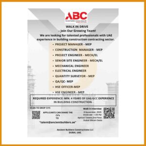 | Send your CV to Ancient Builders Constructions Llc HR email ID : talent@ancientbuilders.ae |