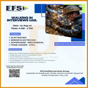 13-8-25 Interview Time : 9 AM-2 PM Interview Location : Makateb 16, Building #1, Sheikh Mohammed Bin Zayed Rd, Dubai Production City, UAE |