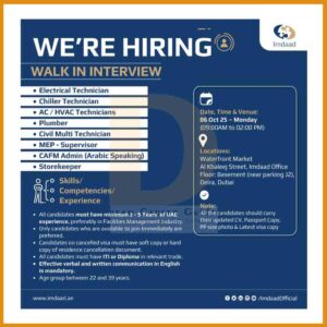 06 Oct 25 – Monday Interview Time : 09:00AM to 02:00 PM Interview Location : Waterfront MarketAl Khaleej Street, Imdaad Office Floor: Basement (near parking J2),Deira, Dubai |