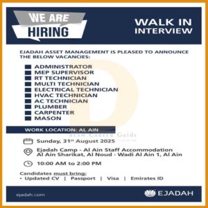 Sunday, 31« August 2025 Interview Time : 10:00 AM to 2:00 PM Interview Location : Ejadah Camp – Al Ain Staff AccommodationAl Ain Sharikat, Al Noud – Wadi Al Ain 1, Al Ain