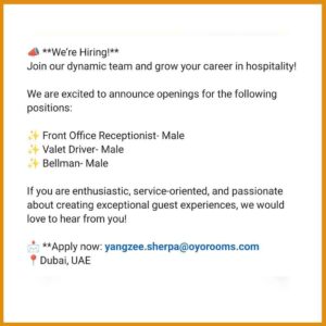 A: No, this is a direct job vacancy from Oyo Rooms and there are no intermediaries involved. If you are selected, you will be hired by Oyo Rooms Dubai and there will be no cost to you. If you receive an offer letter from someone claiming to be Oyo Rooms Dubai , it’s likely a scam. Do not fall for it.